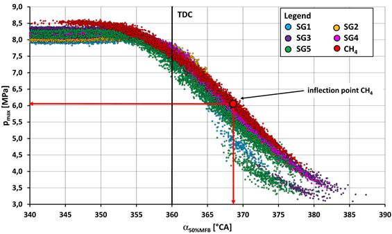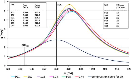 lowest maximum pressure, attributed to spark timing positioned near top dead center (TDC). Methane concentration directly influenced the